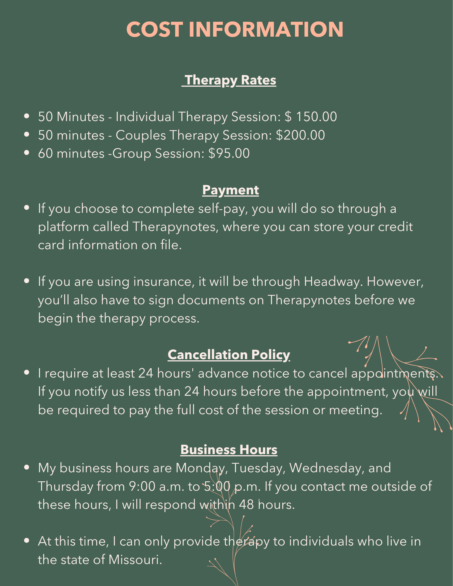 A list of the accepted insurance for therapy sessions. The co-pay will vary by insurance plan.
