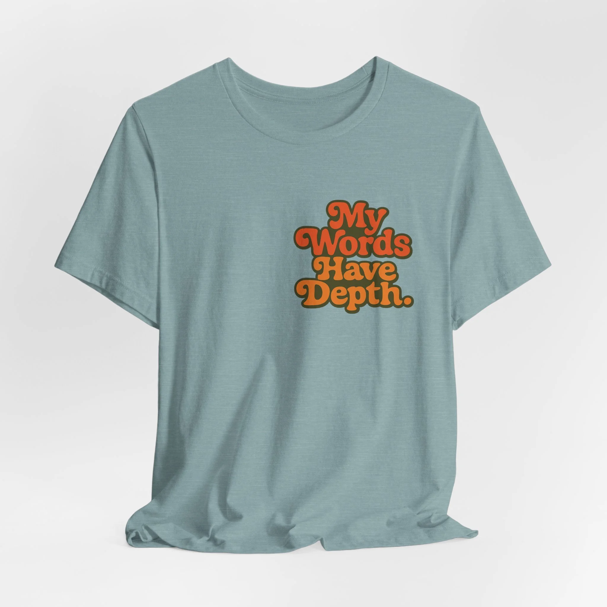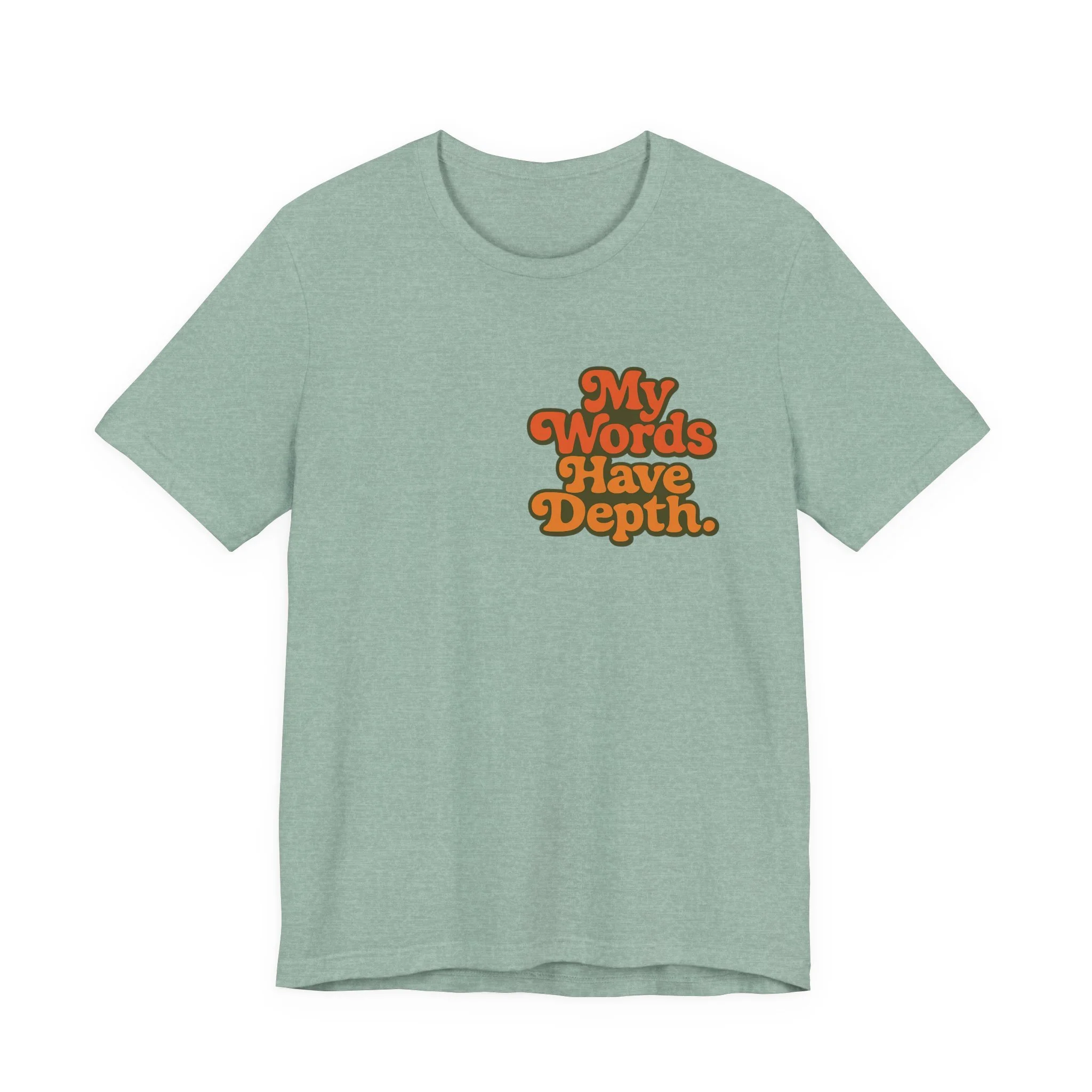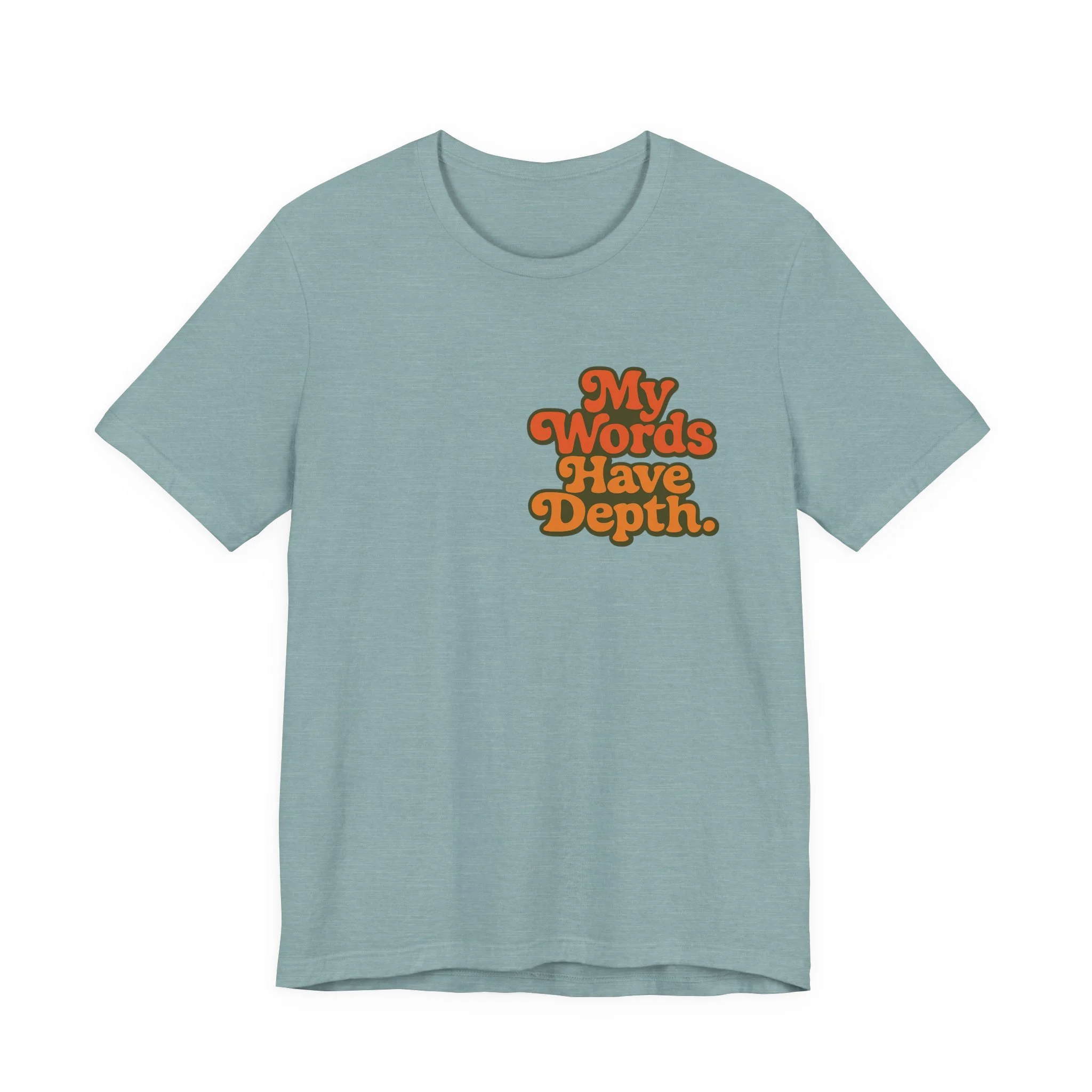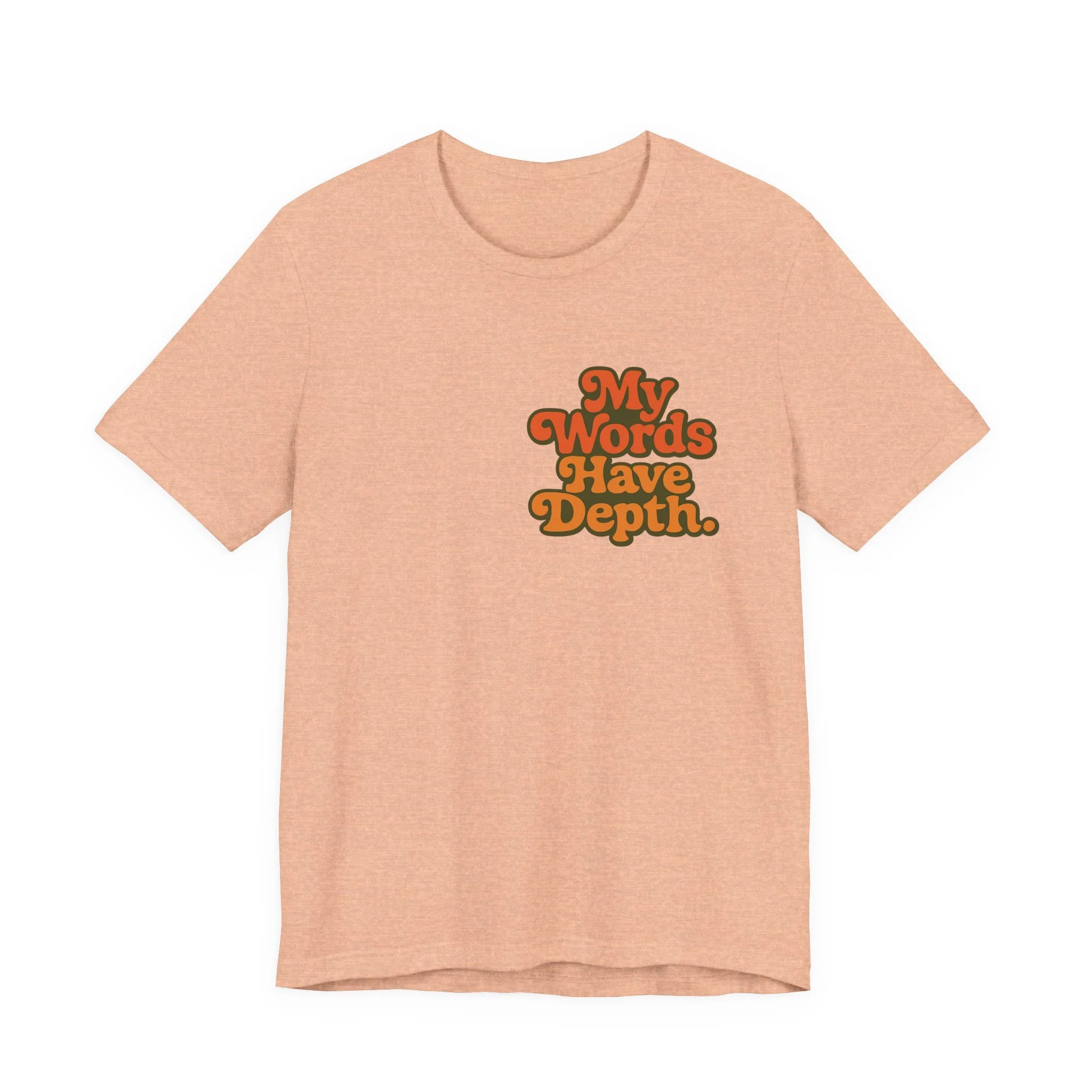 This lightweight jersey tee carries a vintage-minded message — warm, rounded lettering in sunset tones reads “My Words Have Depth.” It sits on a soft, breathable 100% Airlume combed and ring-spun cotton body (with blended options for heathers) and a classic crew neckline. Subtle construction details — side seams, ribbed knit collar with seam, shoulder tape and a tear-away label — keep the shirt comfortable, stable and easy to wear every day. Responsibly made by Bella+Canvas with REACH compliance and fair-labor manufacturing, it’s a casual statement piece that slides into relaxed wardrobes and layered looks alike.