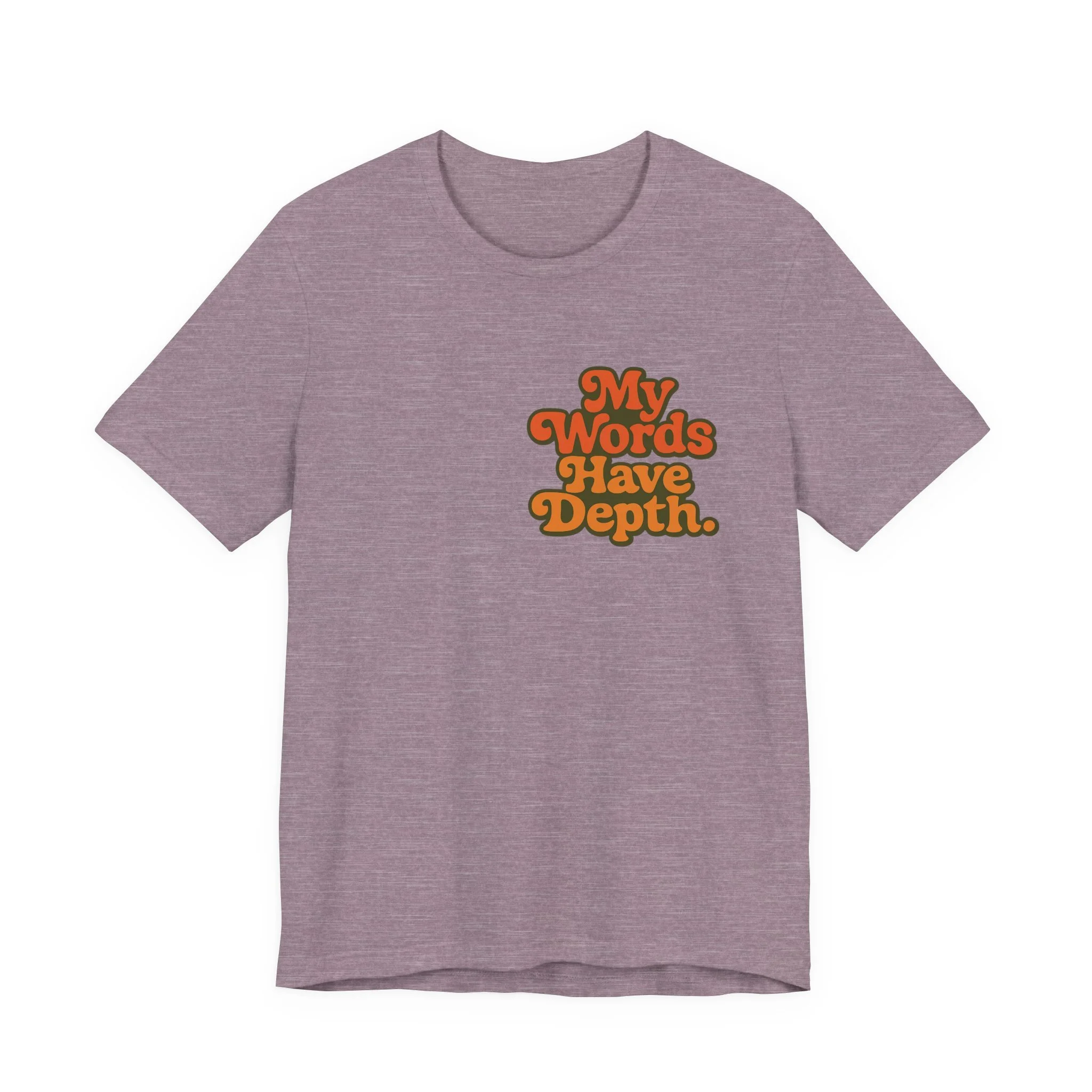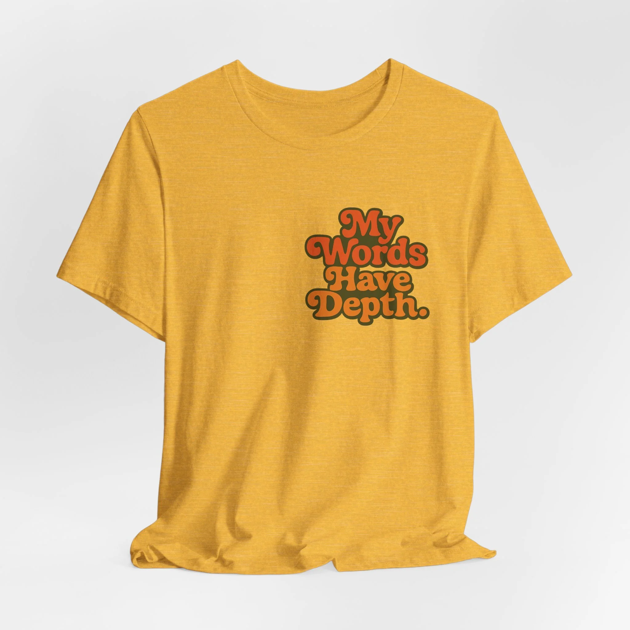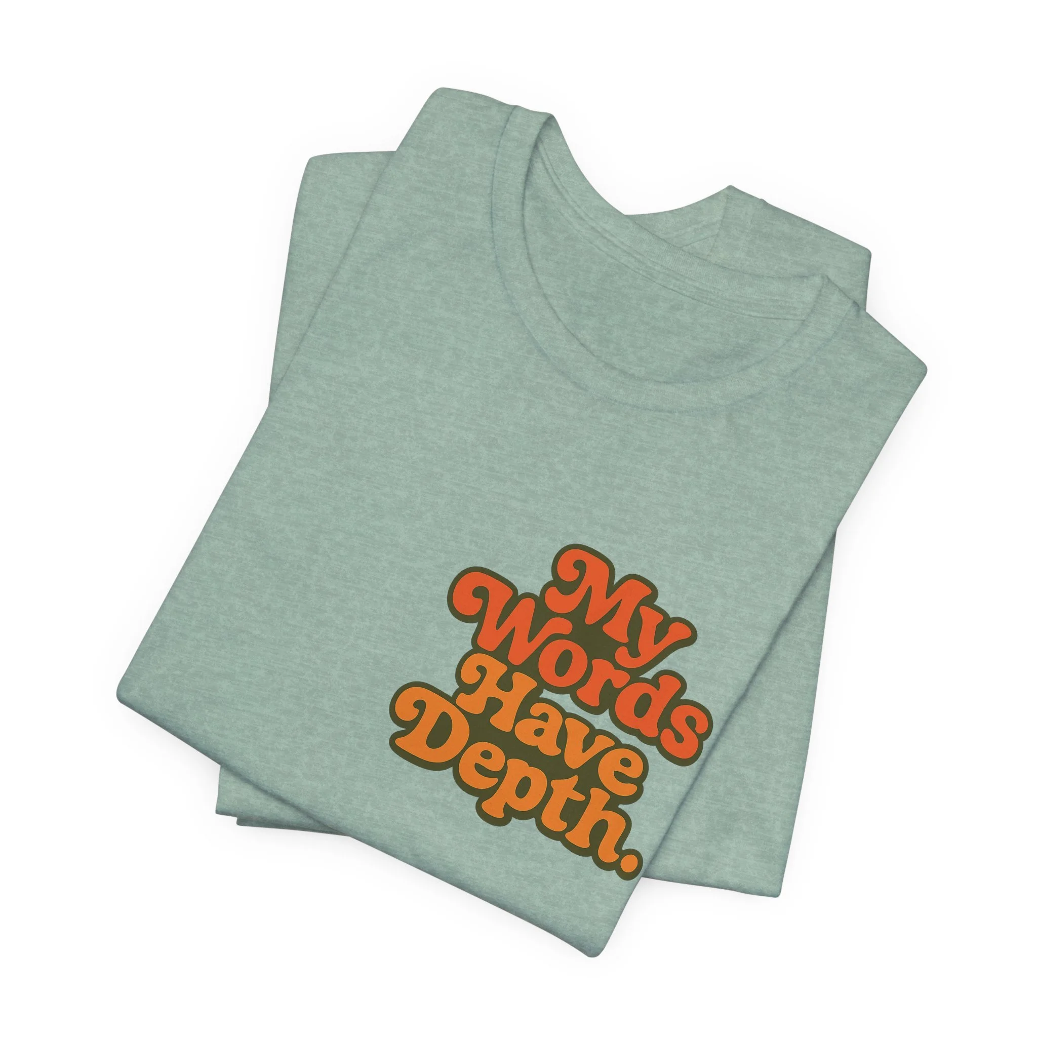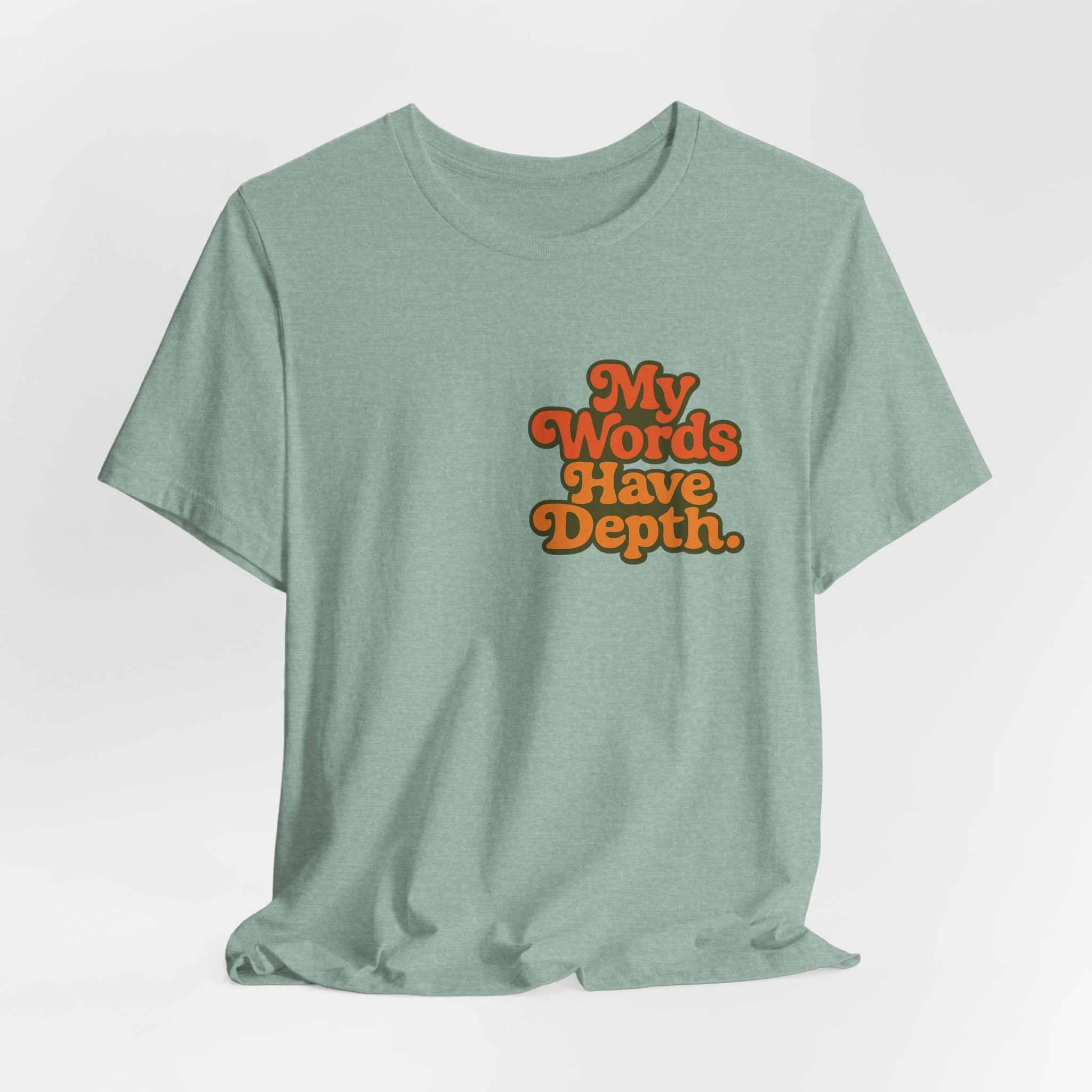 This lightweight jersey tee carries a vintage-minded message — warm, rounded lettering in sunset tones reads “My Words Have Depth.” It sits on a soft, breathable 100% Airlume combed and ring-spun cotton body (with blended options for heathers) and a classic crew neckline. Subtle construction details — side seams, ribbed knit collar with seam, shoulder tape and a tear-away label — keep the shirt comfortable, stable and easy to wear every day. Responsibly made by Bella+Canvas with REACH compliance and fair-labor manufacturing, it’s a casual statement piece that slides into relaxed wardrobes and layered looks alike.