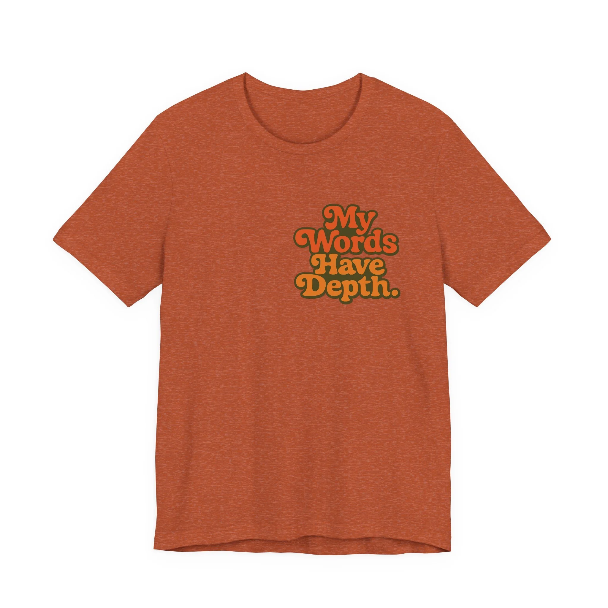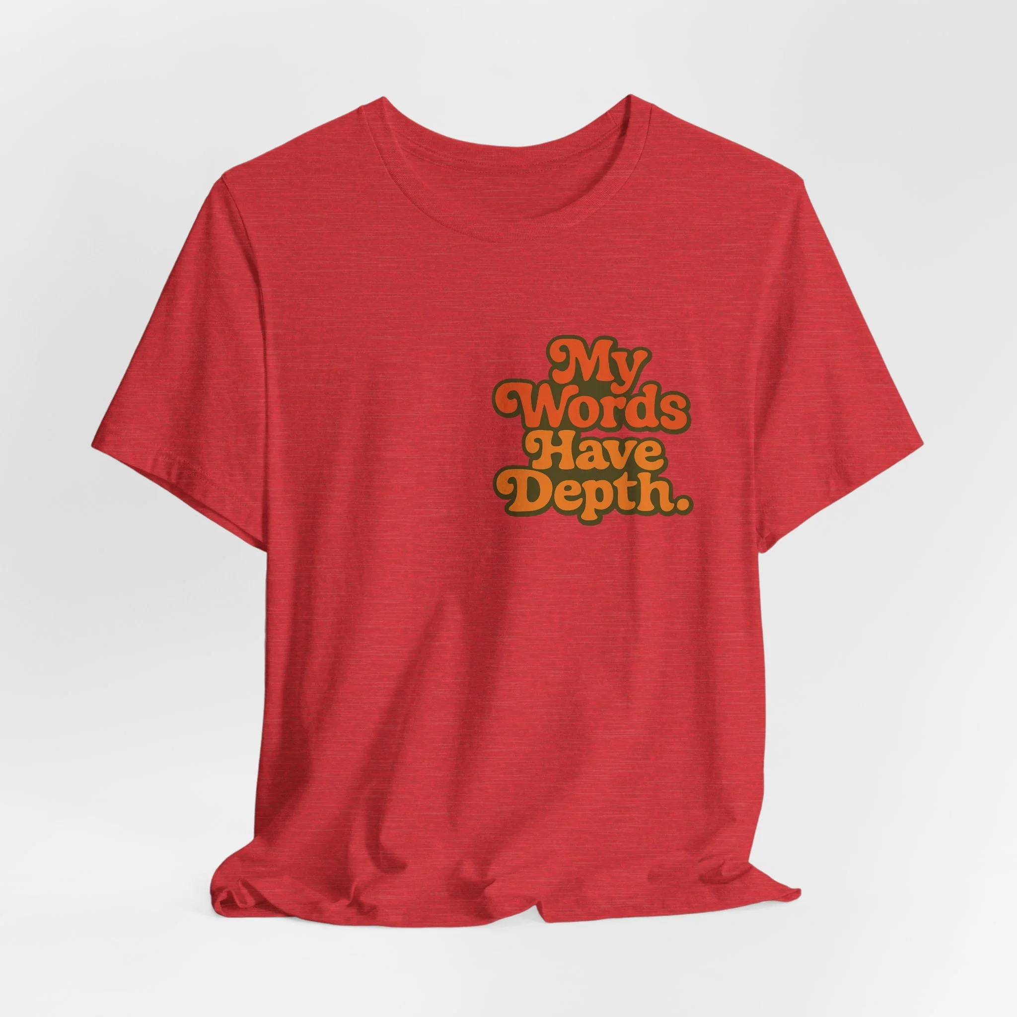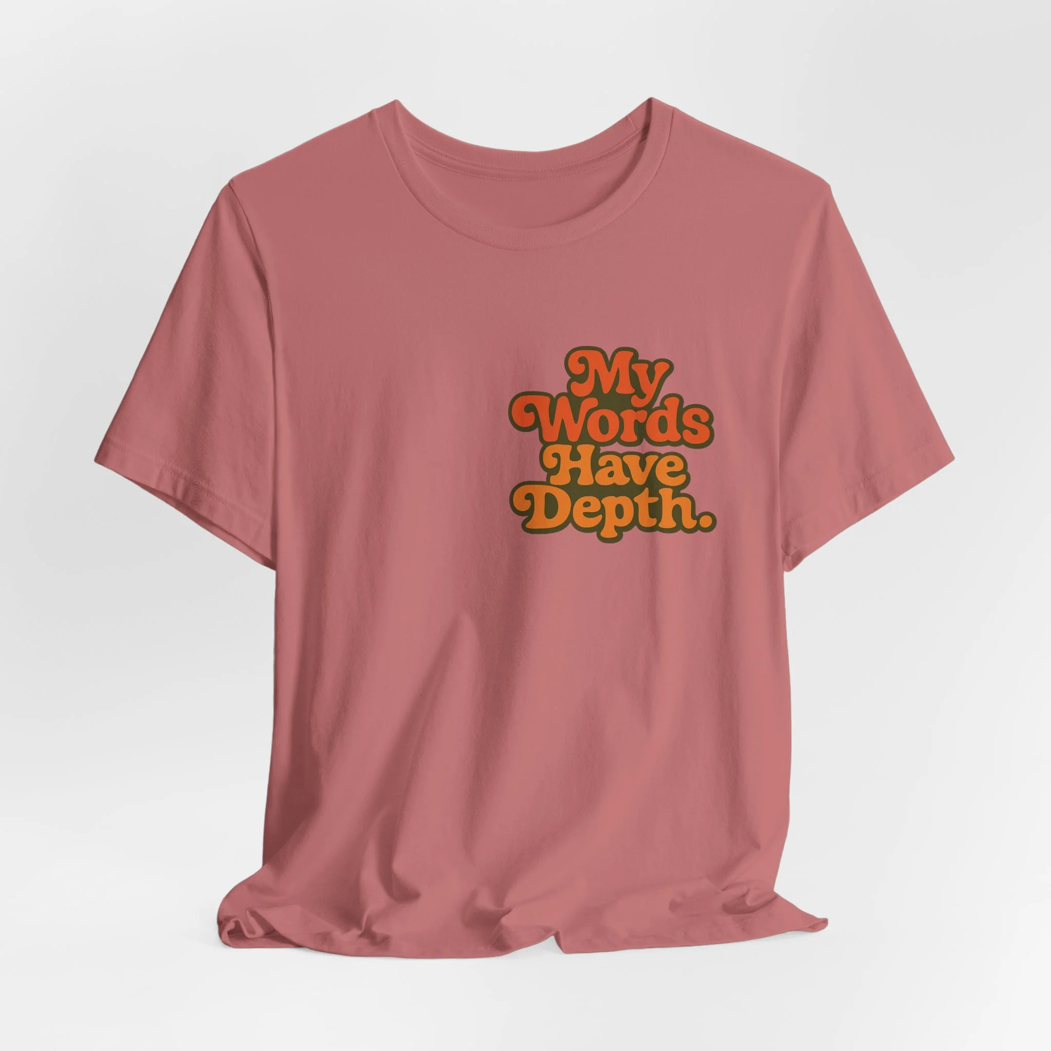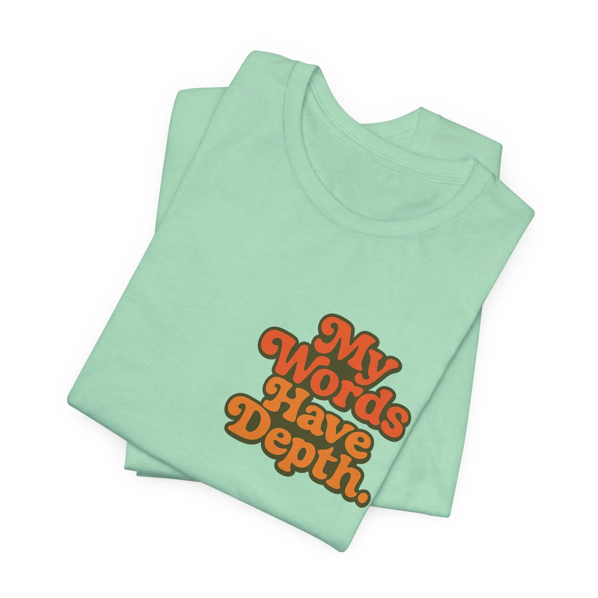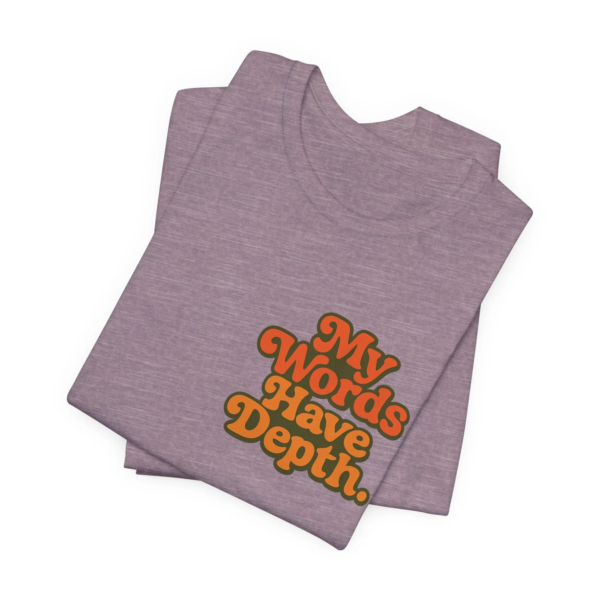 This lightweight jersey tee carries a vintage-minded message — warm, rounded lettering in sunset tones reads “My Words Have Depth.” It sits on a soft, breathable 100% Airlume combed and ring-spun cotton body (with blended options for heathers) and a classic crew neckline. Subtle construction details — side seams, ribbed knit collar with seam, shoulder tape and a tear-away label — keep the shirt comfortable, stable and easy to wear every day. Responsibly made by Bella+Canvas with REACH compliance and fair-labor manufacturing, it’s a casual statement piece that slides into relaxed wardrobes and layered looks alike.