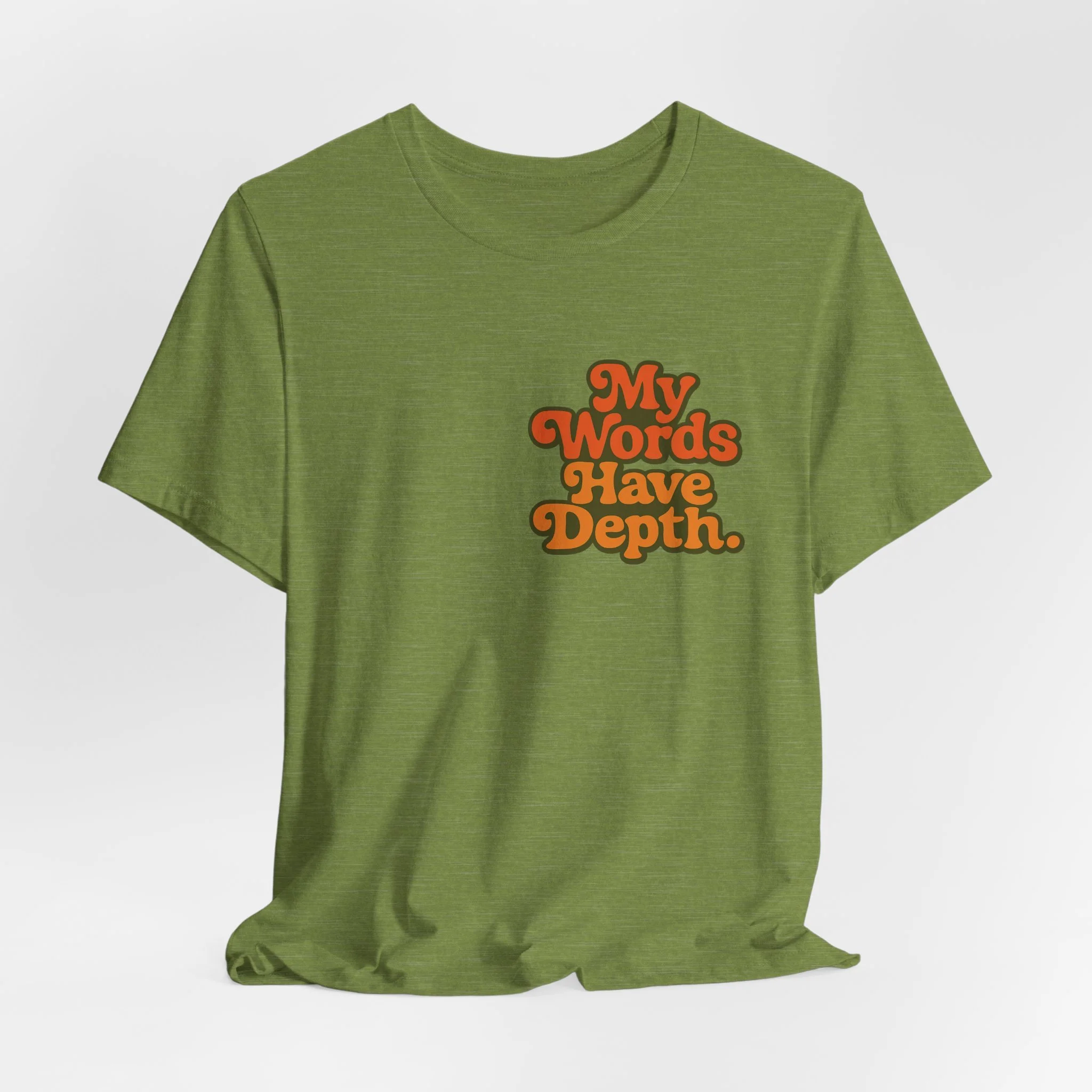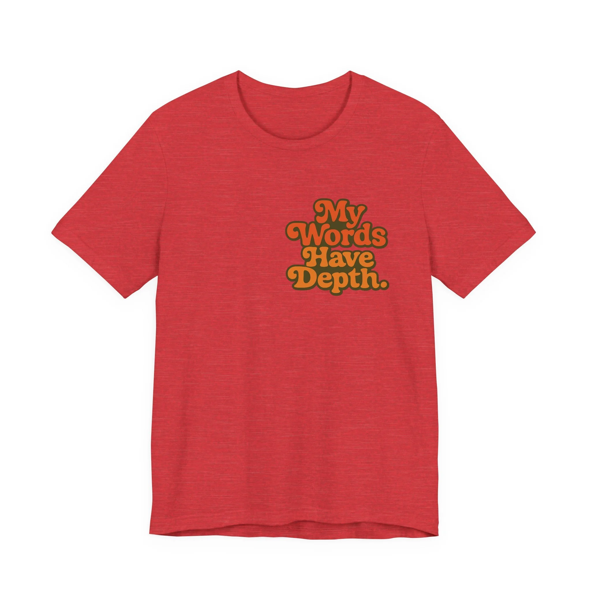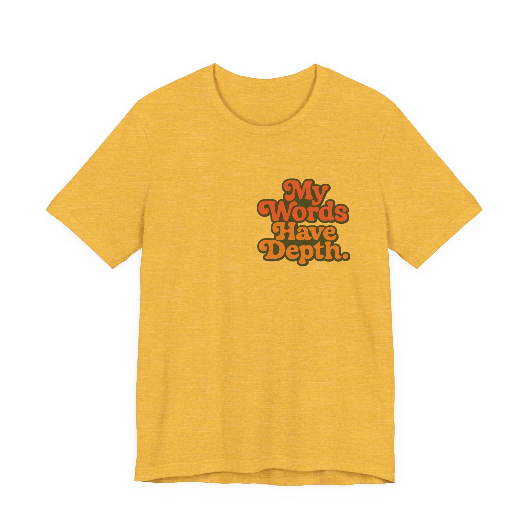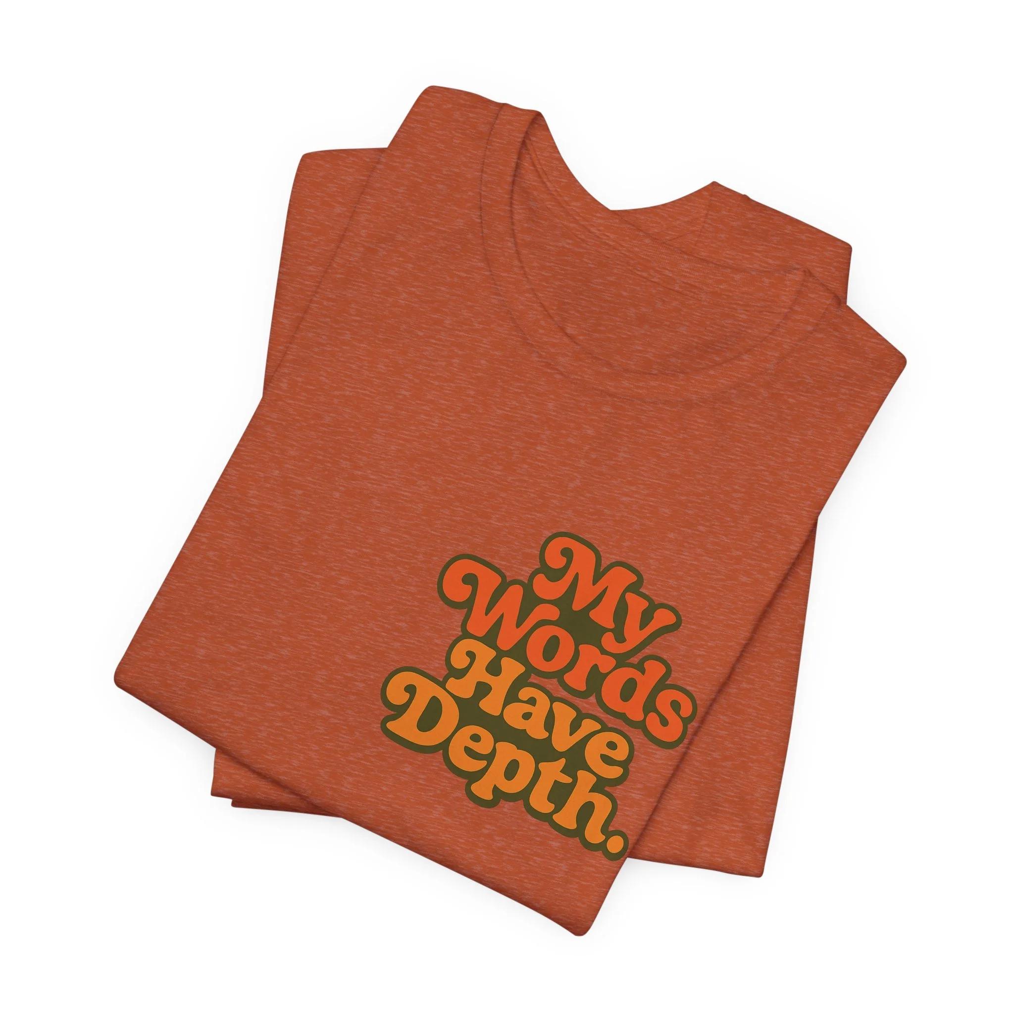 This lightweight jersey tee carries a vintage-minded message — warm, rounded lettering in sunset tones reads “My Words Have Depth.” It sits on a soft, breathable 100% Airlume combed and ring-spun cotton body (with blended options for heathers) and a classic crew neckline. Subtle construction details — side seams, ribbed knit collar with seam, shoulder tape and a tear-away label — keep the shirt comfortable, stable and easy to wear every day. Responsibly made by Bella+Canvas with REACH compliance and fair-labor manufacturing, it’s a casual statement piece that slides into relaxed wardrobes and layered looks alike.