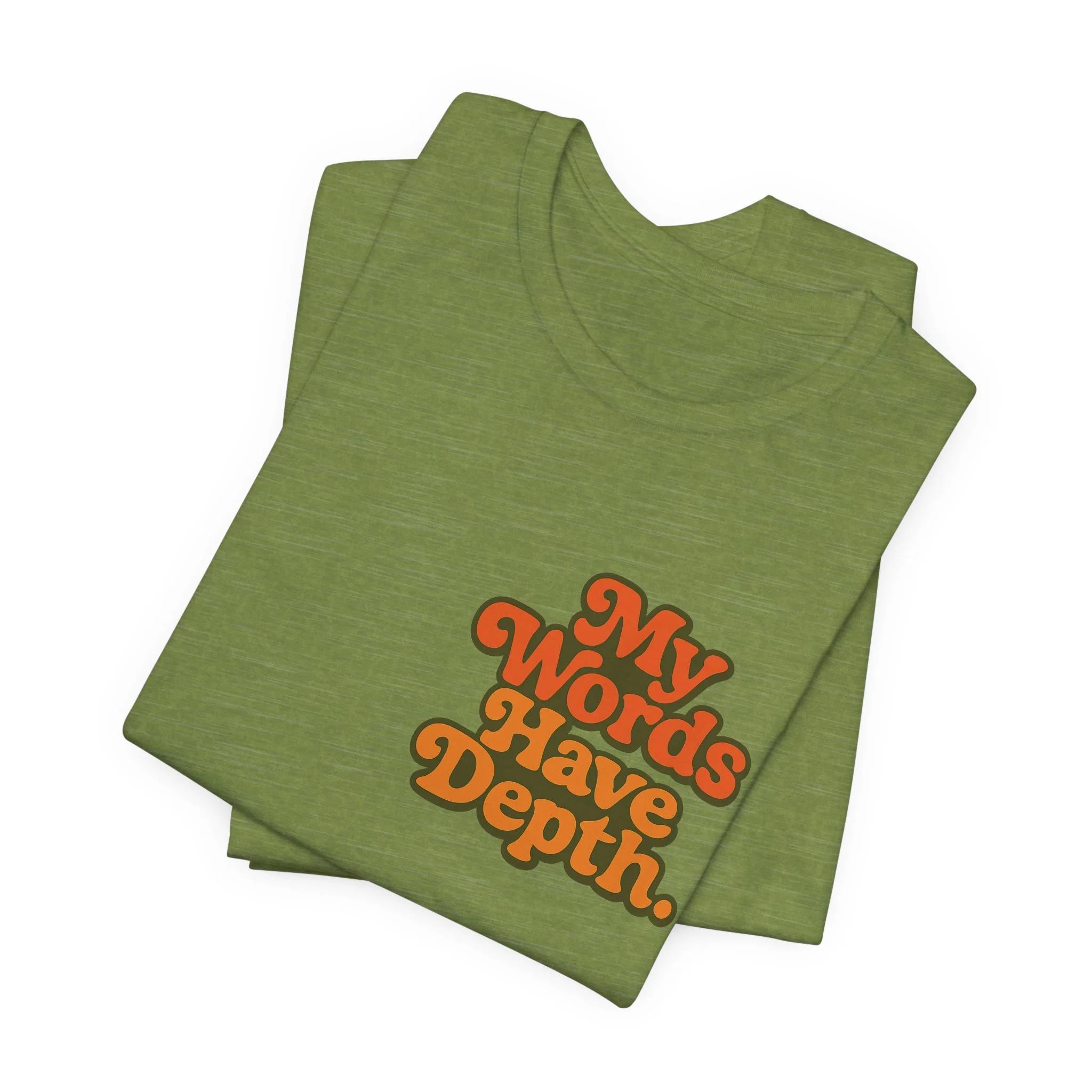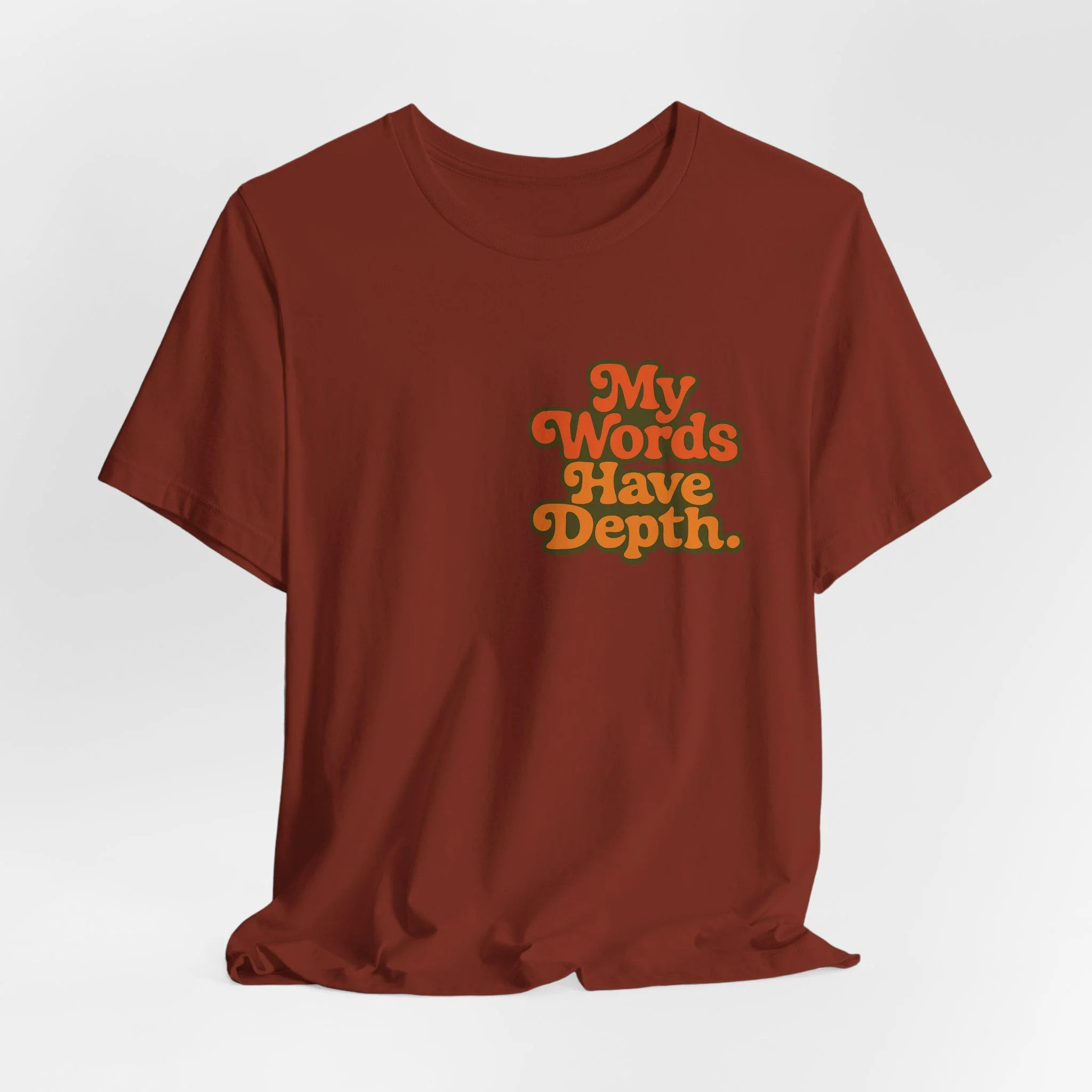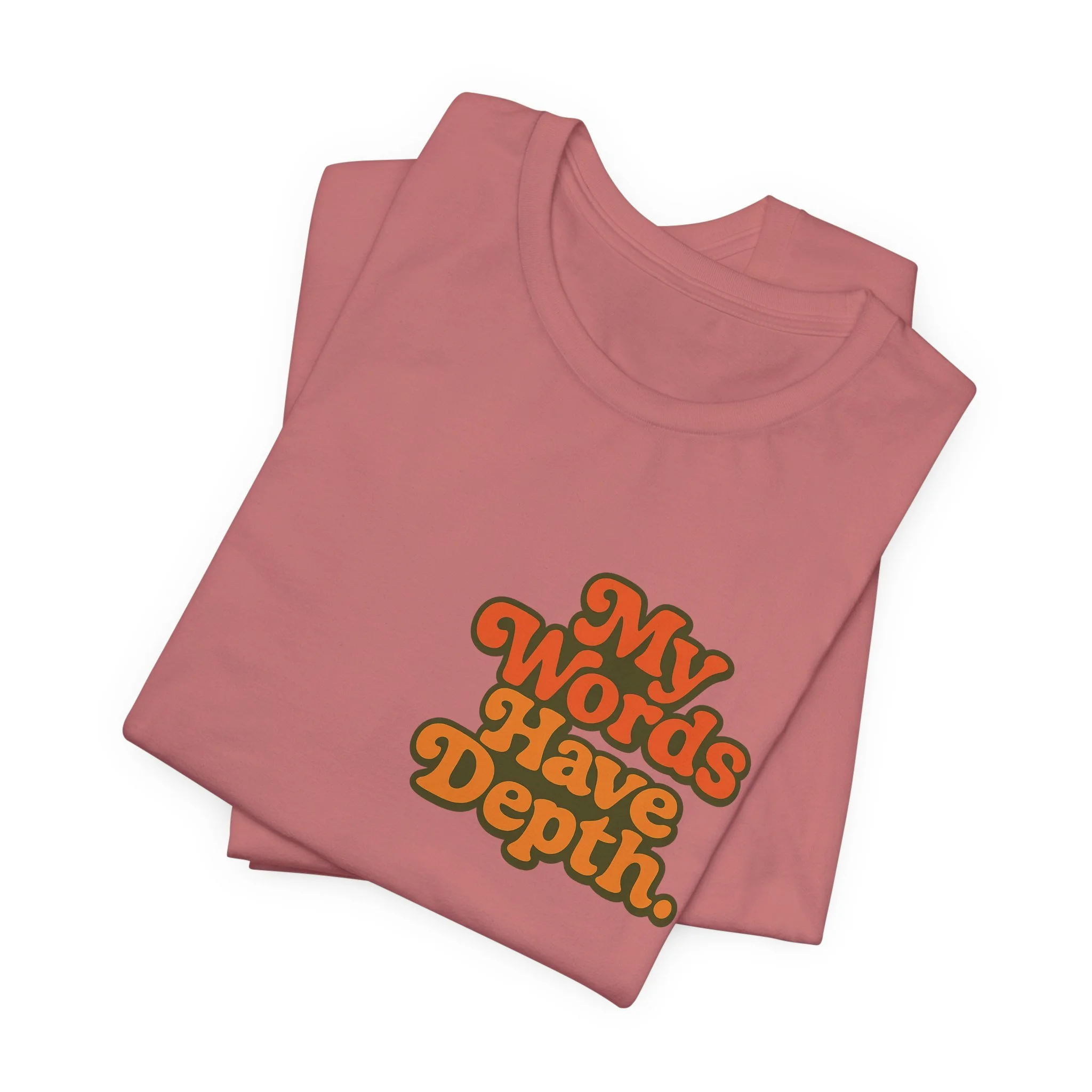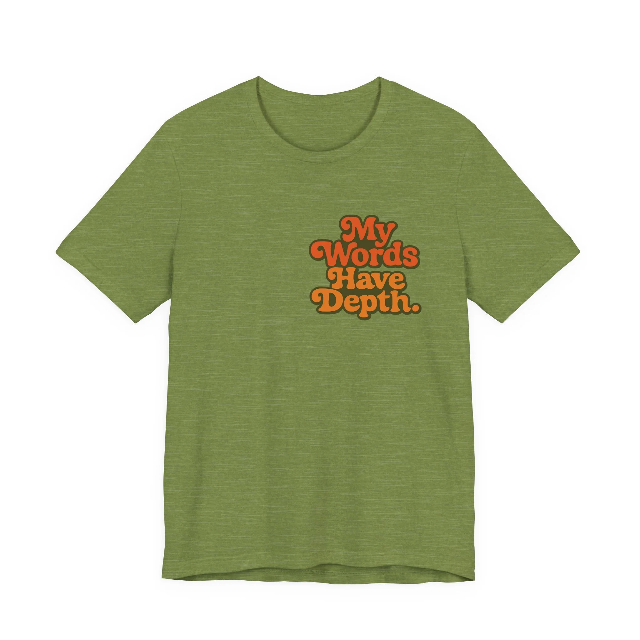 This lightweight jersey tee carries a vintage-minded message — warm, rounded lettering in sunset tones reads “My Words Have Depth.” It sits on a soft, breathable 100% Airlume combed and ring-spun cotton body (with blended options for heathers) and a classic crew neckline. Subtle construction details — side seams, ribbed knit collar with seam, shoulder tape and a tear-away label — keep the shirt comfortable, stable and easy to wear every day. Responsibly made by Bella+Canvas with REACH compliance and fair-labor manufacturing, it’s a casual statement piece that slides into relaxed wardrobes and layered looks alike.